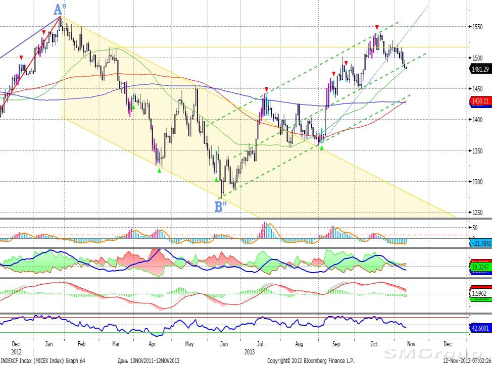 Индекс ММВБ – движется вниз от верхней границы восходящего канала. MACD сформировал сигнал вниз. ADX указывает на прекращение восходящего тренда, DMI+ и DMI- сошлись, ADX в нижней части шкалы и направлен вниз. Осциллятор RSI побывал в зоне перекупленности, сформирован сигнал к снижению. Индикатор, основанный на динамике ADX, 17 октября дал сигнал вниз.