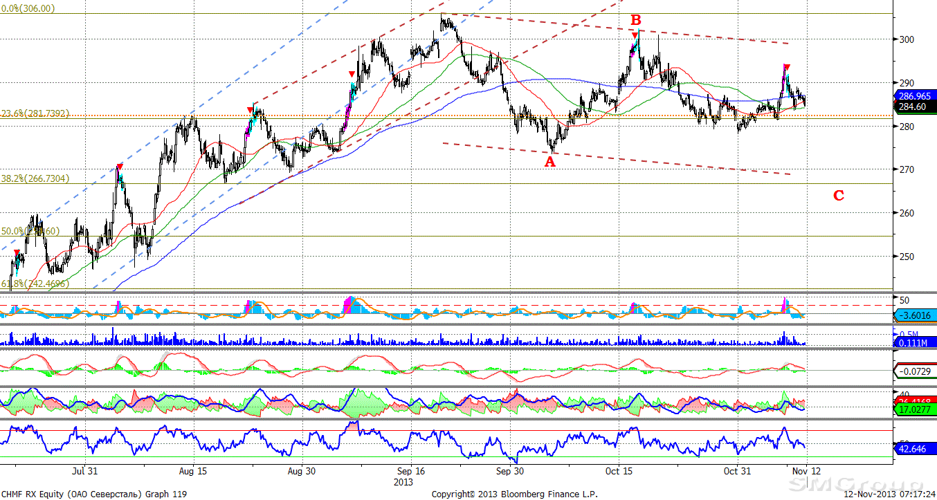 Северсталь – коррекция продолжается. MACD сформировал сигнал вниз. ADX указывает на зарождение нисходящего локального тренда. Осциллятор RSI побывал в зоне перекупленности, сформирован сигнал вниз. Индикатор, основанный на динамике ADX, 8 ноября сформировал сигнал к снижению.