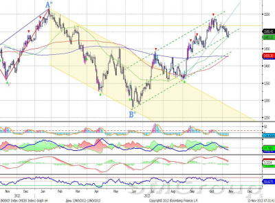 Индекс ММВБ – движется вниз от верхней границы восходящего канала. MACD сформировал сигнал вниз. ADX указывает на прекращение восходящего тренда, DMI+ и DMI- сошлись, ADX в нижней части шкалы и направлен вниз. Осциллятор RSI побывал в зоне