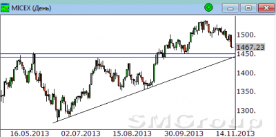 Индекс ММВБ. Локальный даунтренд по-прежнему в силе. Прошедший отскок вверх вернул индекс к зоне сопротивления, образованной горизонтальным уровнем предложения у отметки 1500 пунктов, а также диагональным сопротивлением в районе отметки 1510