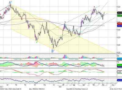 В настоящее время цены сформировали сужающийся диапазон торгов, образованный и диагональным сопротивлением и горизонтальным уровнем поддержки. В ближайшее время индекс продолжит консолидироваться в рамках данного диапазона. В дальнейшем выход из