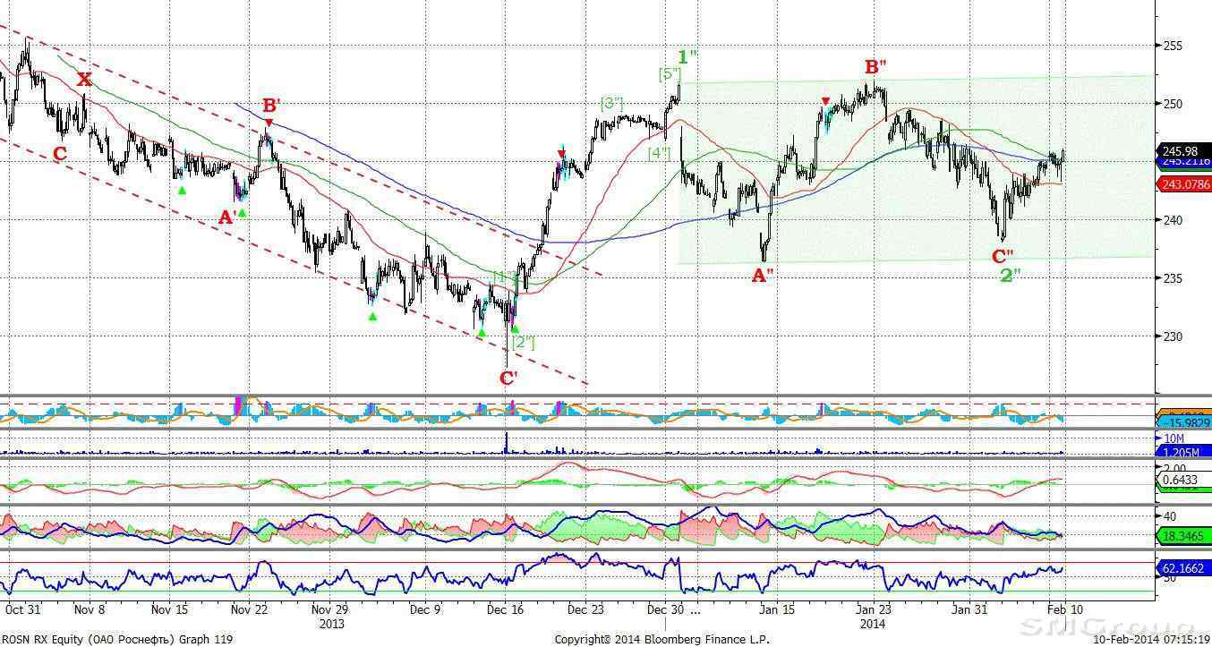 Индекс ММВБ – попытка начала формирования восходящего тренда, в ближайшее время возможна локальная коррекция роста. MACD отрабатывает сигнал вверх. DMI+ находится выше DMI- (индикаторы сходятся), ADX в средней части шкалы и развернулся вниз, что указывает на замедление восходящего локального тренда. Осциллятор RSI вошел в зону перекупленности, но сигналов пока нет, возможно скорое формирования сигнала вниз. Индикатор, основанный на динамике ADX, 7 февраля дал сигнал к снижению.